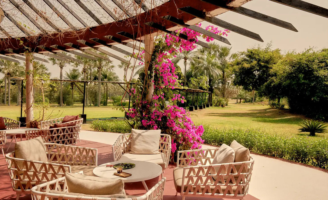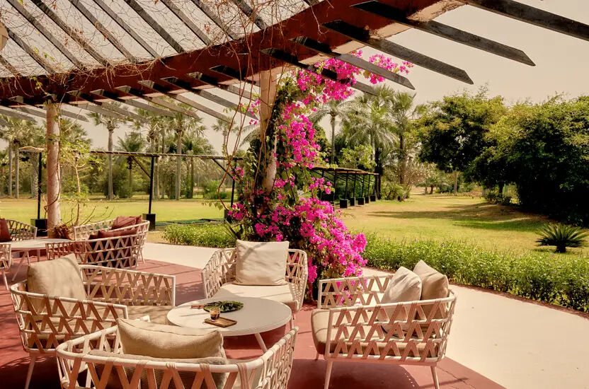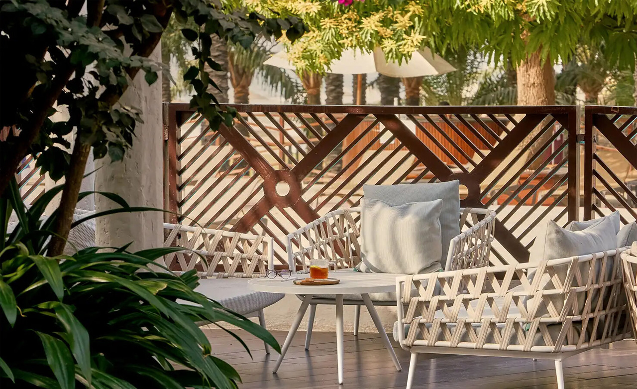 Terrasse ausgestattet. Die Dekoration ist eine Hommage an die Natur und das