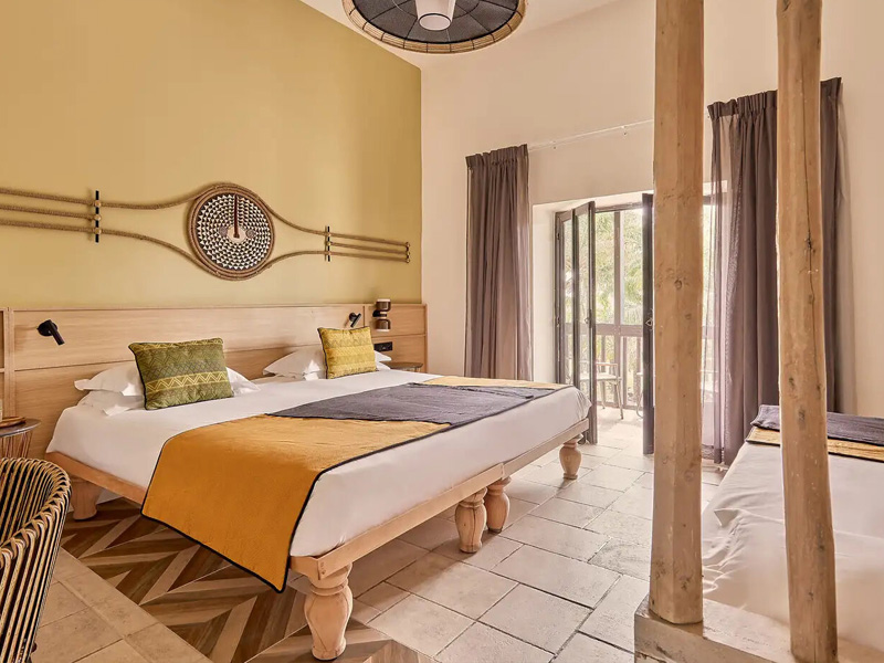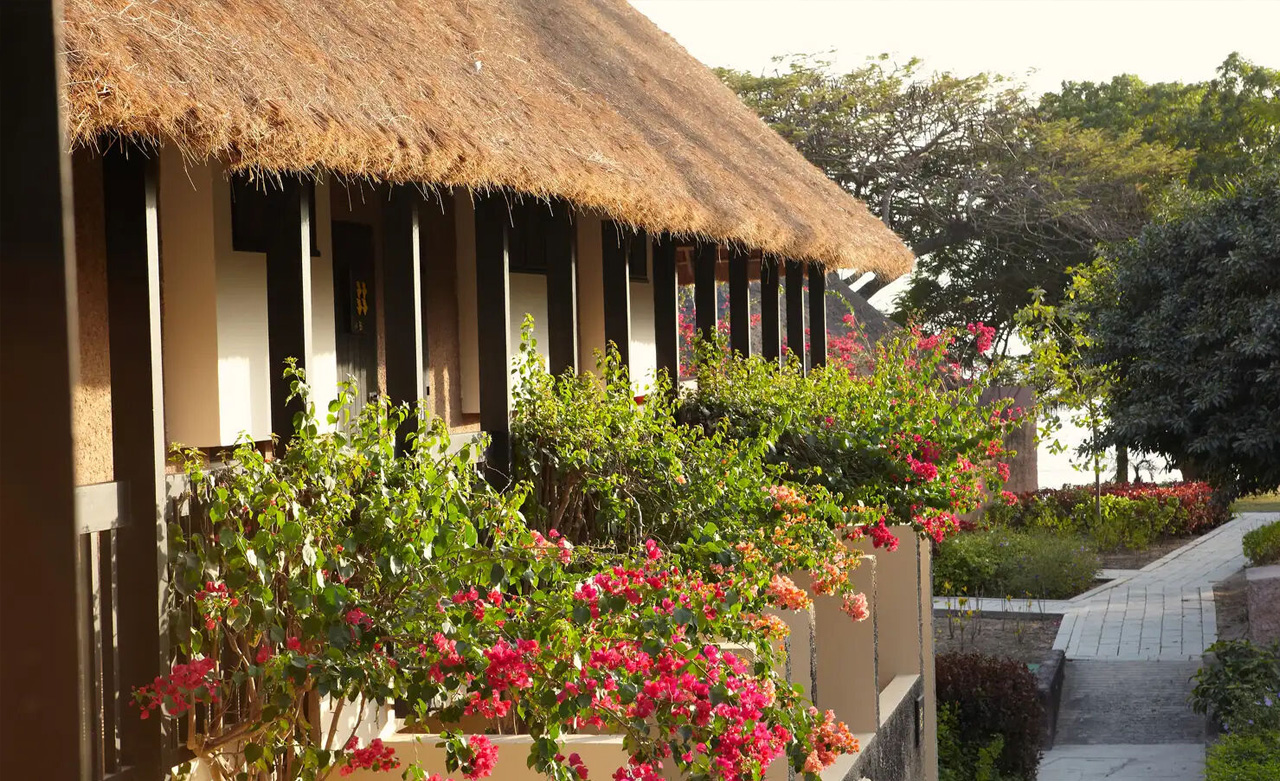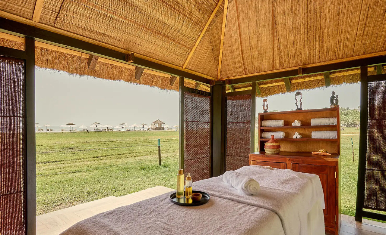 Umgeben von grüner Pflanzenwelt und goldenen Stränden können Sie sich unter Strohdächern und ockerfarbenen Wänden entspannen. Alle Zimmer verfügen über einen Balkon oder eine Terrasse, von denen aus Sie exotische Vögel inmitten von Kokospalmen bewundern können.