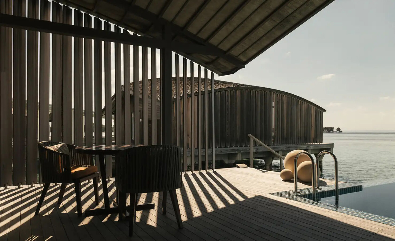 Diese Villa mit schildkrötenförmigem Dach und einer Holztreppe, die Sie direkt in das türkisblaue Wasser führt, übertrifft Ihre Vorstellungskraft. Das zeitgemäße und unaufdringliche Design fügt sich wunderbar in die natürliche Umgebung ein.