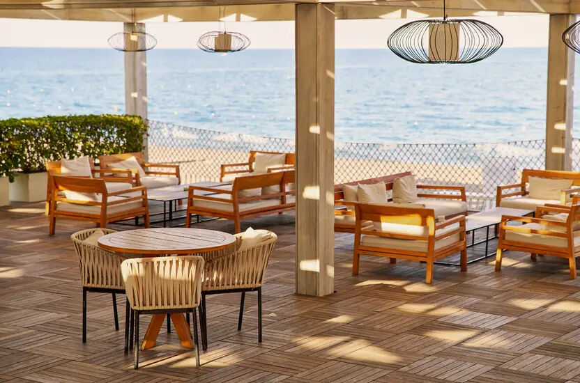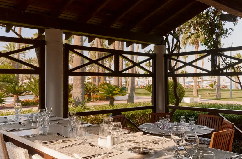 dieses unglaublichen Resorts. Ein Tisch auf der geräumigen, sonnigen Terrasse