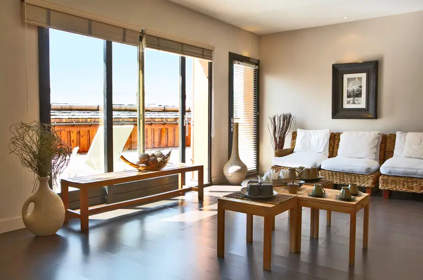 Ihre Terasse lädt dazu ein, sich auf einer Sonnenliege zu entspannen und den freien Blick auf die Berge zu genießen. Das Wohnzimmer, der begehbare Kleiderschrank und das Badezimmer mit Dusche und Badewanne machen diese Suite zu etwas ganz Besonderem.