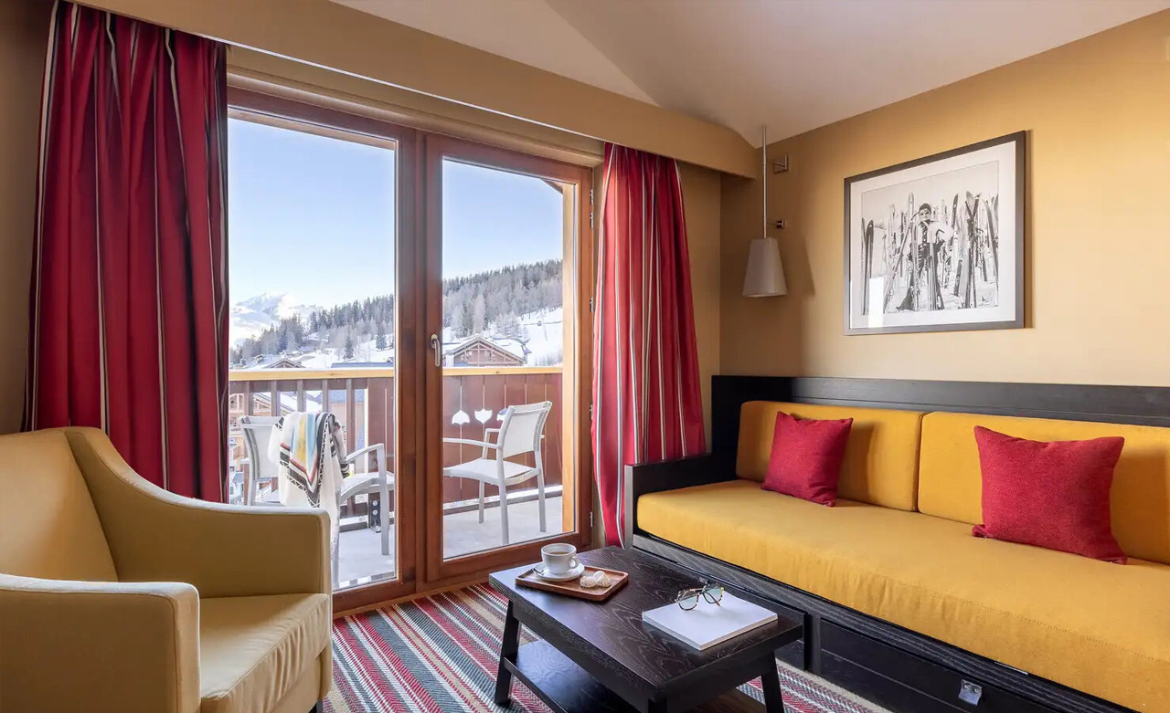 Blicken Sie von Ihrem Balkon auf die Berge oder das Tal. Ihr Zimmer hat eine eigene Lounge, in der Sie sich entspannen können. Die Grau- und Rottöne in Kombination mit dem Holz schaffen eine angenehme Atmosphäre.