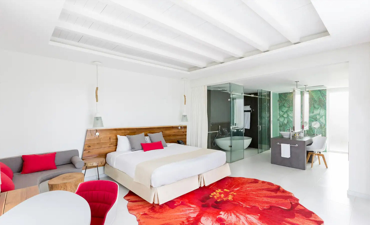 Diese Zimmer befinden sich im ersten Stock eines der 26 kleinen Gebäude, die sich um den großen Pool gruppieren. Sie sind der perfekte Ort zum Entspannen, mit überdachten Liegen auf einer großen Terrasse. Die geräumigen, in Rot und Schwarz gehaltenen Zimmer sind mit viel Liebe zum Detail eingerichtet.
