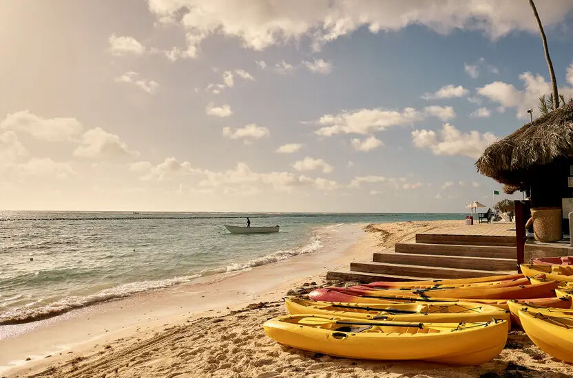 Den wunderschönen Strand und seine Kokosnusshaine vom karibischen Ozean aus zu sehen, ist einer der schönsten Anblicke. Ein Kajak ist das ideale Transportmittel für dieses Abenteuer.