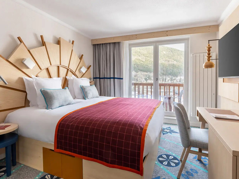Ohne Balkon: Das Superior-Zimmer ist ideal für Paare, hell und komfortabel. Die Einrichtung ist von der lokalen Handwerkskunst inspiriert und verbreitet eine warme Atmosphäre, ebenso wie der Teppich mit den Holzschnitzereien von Queyras.