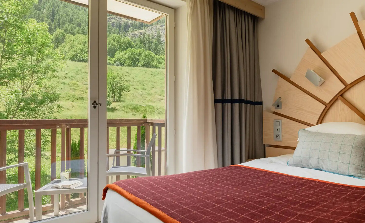 Ohne Balkon: Das Superior-Zimmer ist ideal für Paare, hell und komfortabel. Die Einrichtung ist von der lokalen Handwerkskunst inspiriert und verbreitet eine warme Atmosphäre, ebenso wie der Teppich mit den Holzschnitzereien von Queyras.