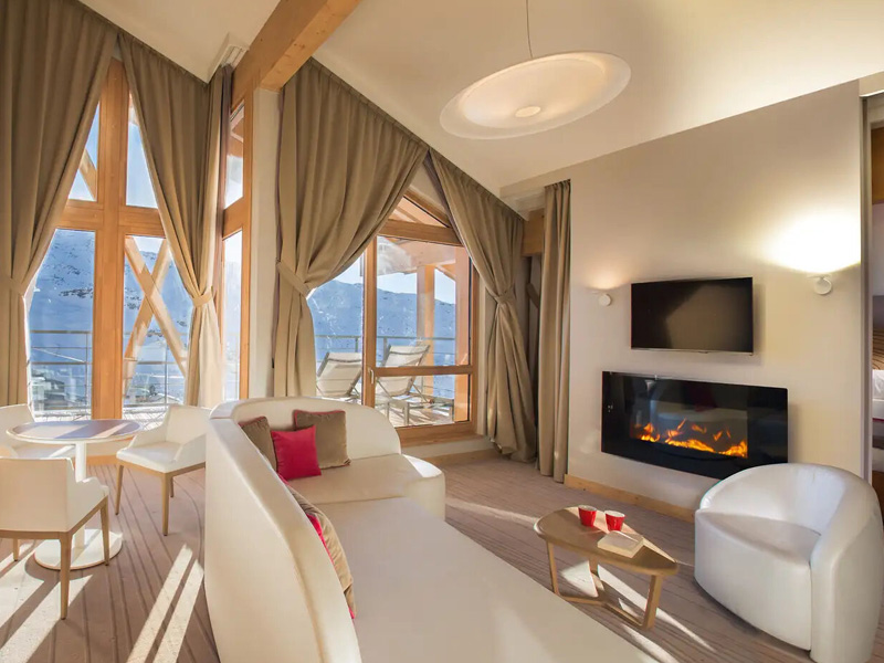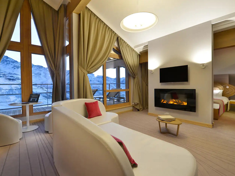 Der Designer-Kamin im Wohnzimmer bildet das Herzstück dieser gehobenen Suite. Der Außenbereich bietet einen unschlagbaren Blick über die Gebirgskette.