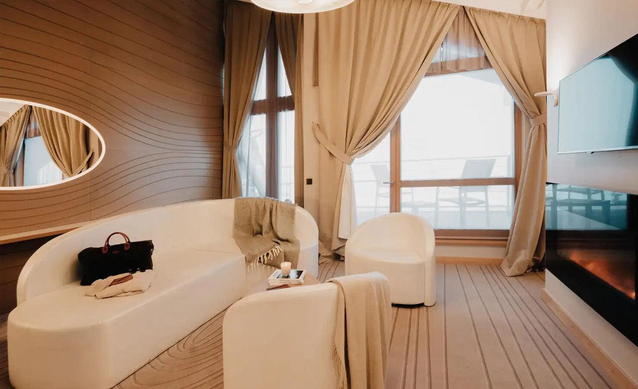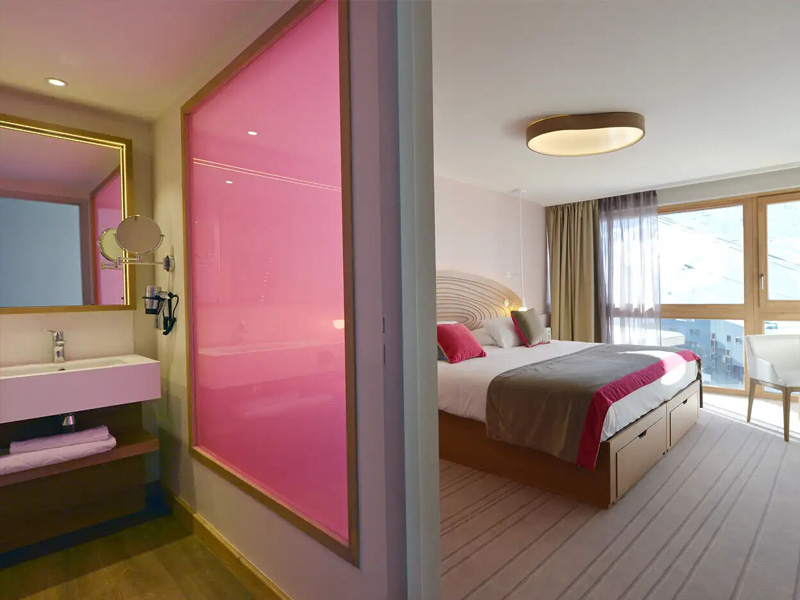 Diese kühne, moderne Architektur mit atemberaubendem Blick auf die Berge bricht mit der Tradition. Die Zimmer erstrahlen in eleganten Möbeln, organischen Kurven und überraschenden Rosatönen.