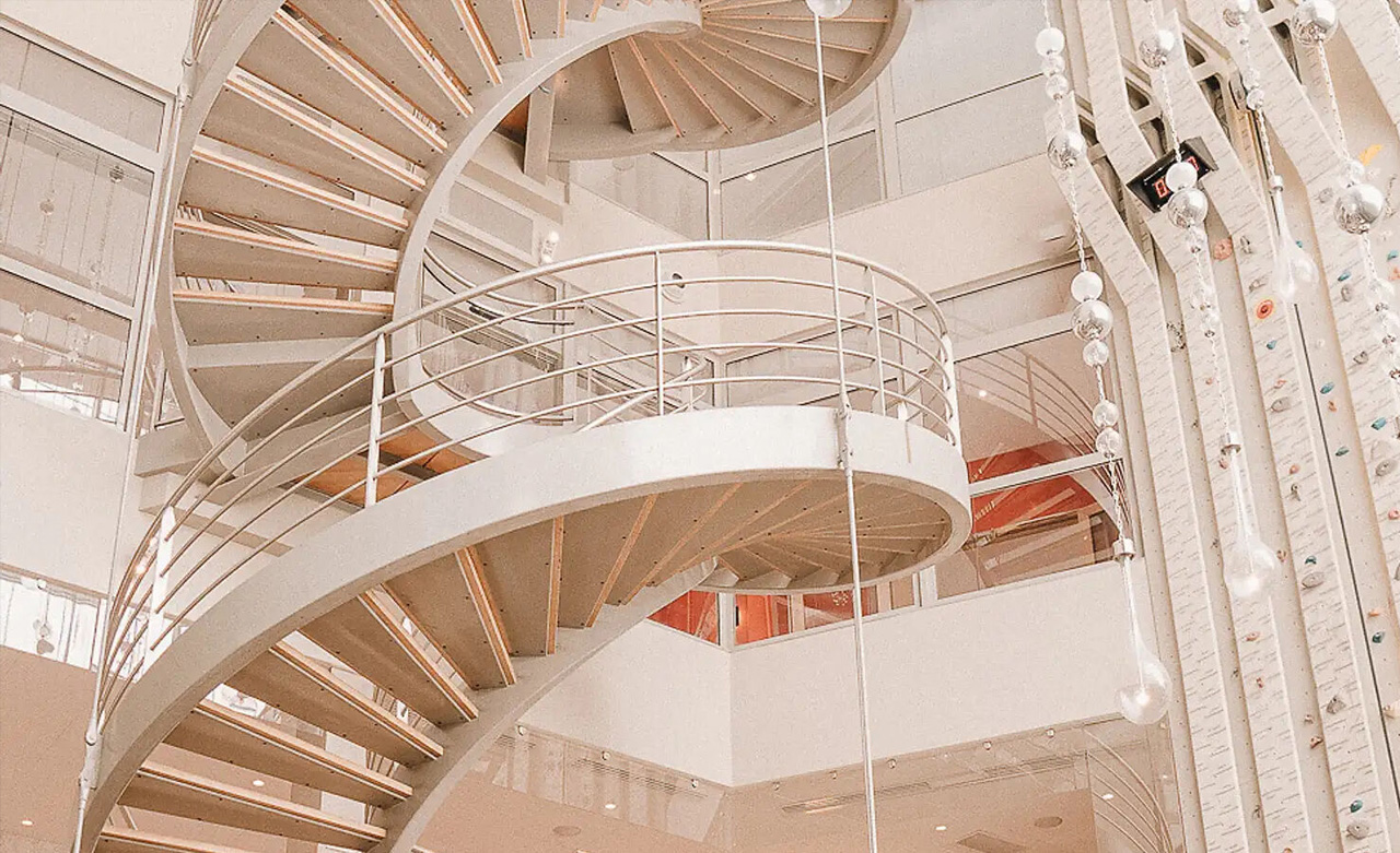 Wie eine vertikale Kunstskulptur ragt die Indoor-Kletterwand des Atriums 10 Meter in die Höhe und lädt dazu ein, der Schwerkraft zu trotzen.